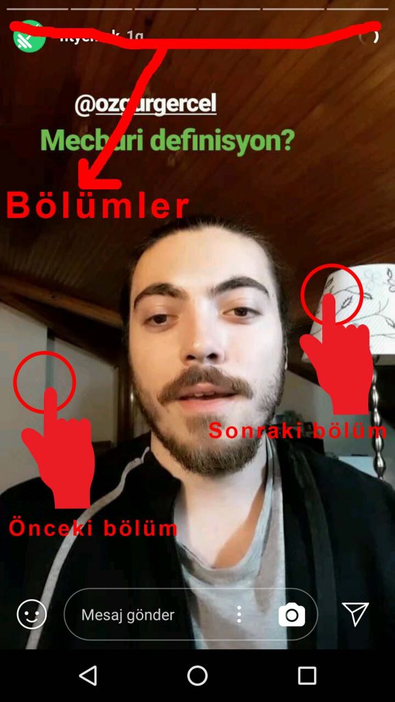 Bir kullanıcı bölümlerden oluşan hikaye paylaştığında hikayenin bir önceki bölümüne gitmek için ekranın sol bölümüne tıklamanız paylaşılan hikayede bir önceki bölüme geçiş yapacaktır. Ekranın sağ tarafına dokunmanız paylaşılan hikayenin bir sonraki bölümüne geçiş yapacaktır.