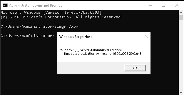 Lisansınızın kaç güç kaldığını görmek için aşağıdaki slmgr /xpr komutunu kullanabilirsiniz. Aşağıdaki örnek görselde, 16.09.2025 tarihinde deneme lisans süresinin biteceği görünüyor.