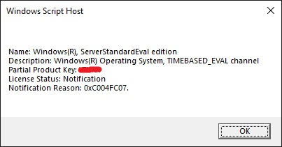 Öncelikle slmgr -dli komutu ile deneme lisans durumunu kontrol edin, Aşağıda ki örnekte, deneme lisans süresinin bittiği ve uyarı (Notification) aşamasında olduğu görünüyor